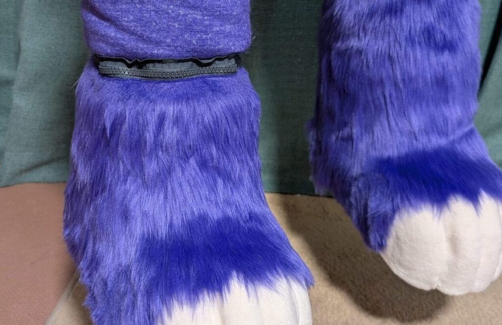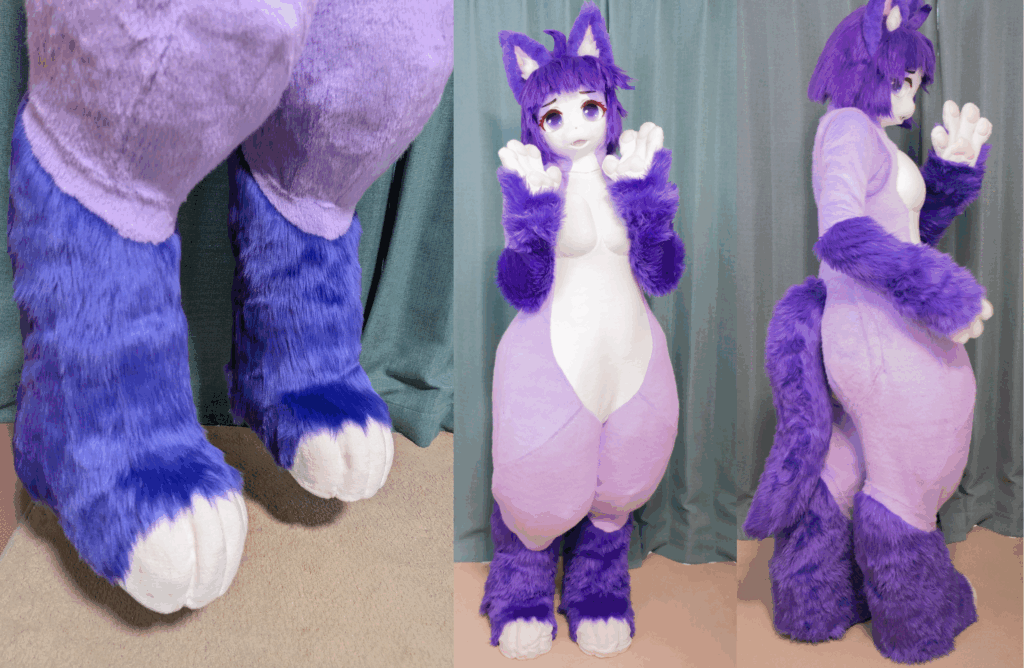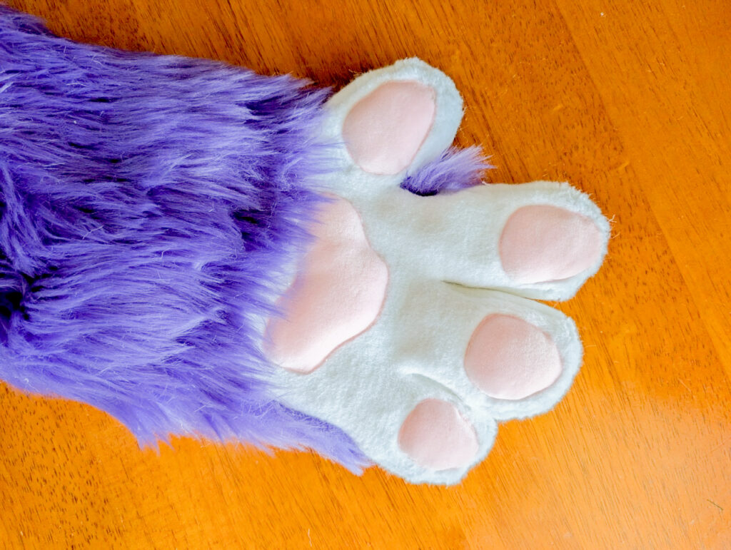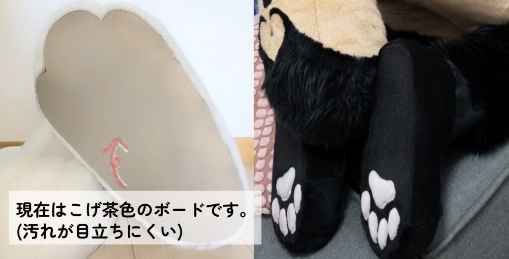 足裏は基本的ボード製(外歩き可)ですが、ふわふわの肉球に変更(室内履きor着ぐるみ用靴)出来ます。
